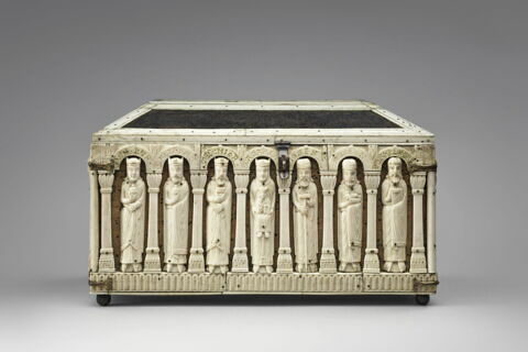 L'ensemble du coffret est bordé de larges bandes moulurées, en partie refaites. 28 figures et une demi-figure occupent le toit et la caisse. Sur chacun des longs côtés du toit sont groupés 5 personnages, entre des colonnes sans chapiteau ni base, ornées de motifs gravés. Une seule figure, dont les pieds ont été coupés, occupe chaque petit côté du toit. Sur les longs côtés de la caisse sont groupées, du côté de la serrure, 6 figures et une demi-figure sous la serrure, séparée par des colonnettes à la base ajourée d'un type que l'on ne retrouve pas sur les autres pièces du même groupe ; de l'autre côté, 6 figures sont séparées par des bandes d'os plates. Sur les petits côtés, se tiennent 2 figures encadrées de bizarres colonnes ajourées (modernes). La plupart des personnages sont barbus et tiennent un livre ; plusieurs sont couronnés, 18 sont pieds nus, ce qui excède le nombre des apôtres. Aucun programme iconographique cohérent ne transparaît dans cette composition.