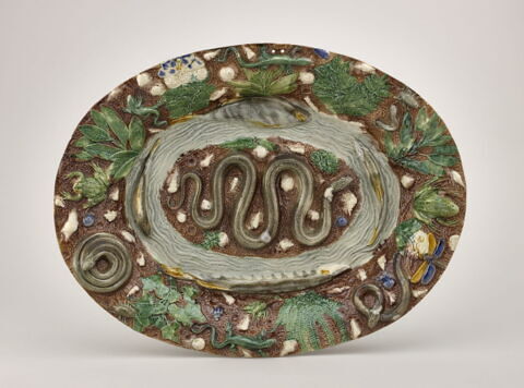 Plat ovale polychrome décoré au centre d'une couleuvre repliée sur le marli d'un lézard, de deux grenouilles et deux écrevisses. Revers jaspé. Céramique, terre argileuse, glaçure plombifère ; terre dite vernissée France, fin du XVIe siècle-début du XVIIe siècle.