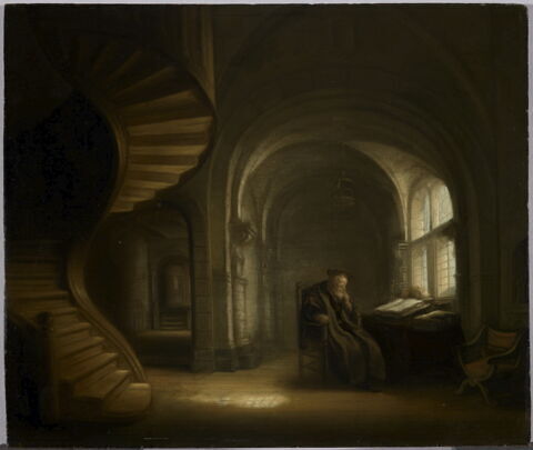 - ? P. Wouters, marchand d’Anvers (inventaire après décès, 23 VIII 1673 : escalier à vis avec vieil homme assis). – ? Catharina Deyl, veuve du peintre N. Rosendael d’Amsterdam (inventaire après décès, 7 III 1687 : Rembrandt, escalier à vis). – collection du comte de Fraula à Bruxelles, 1738 (Lugt 488), lot n°136 (Hoet I, 530, no. 135) – W. Lormier (1682-1758), La Haye (cf. son cat. manuscrit cité par Korthals Altes) ; vendu en 1748 avec 16 autres tableaux hollandais à Marc-René de Voyer, marquis d’Argenson (1722-1782), fils et neveu des deux d’Argenson ministres de Louis XV ; sans doute mis en pendant par lui avec un autre Philosophe de « Rembrandt » (voir Koninck, INV. 1741) ; cédé par Voyer avec son pendant à Claude-Alexandre de Villeneuve, comte de Vence (1702-1759), vers 1751, les deux Philosophe étant déjà cités chez Vence par Dezallier d’Argenville (1752) et Descamps (1754) ; gravé en 1754 par L. Surugue comme Philosophe en contemplation, le pendant l’ayant été en 1753 ; vente après décès du comte de Vence, Paris, 9-16 II 1761, n° 39 (en pendant au n° 38, avec notice commune pour les deux tableaux à vendre séparément) ; non vendu, car choisi par Voyer dans le legs de deux tableaux de cette vente que lui avait fait Vence ; cédé par Voyer, sans doute peu après, à Étienne-François, comte de Stainville, duc de Choiseul (1719-1785), ministre de Louis XV pour être bientôt réuni à son pendant (Koninck, INV. 1741) ; gravé avec ce dernier par Baillie en 1771 dans le Cabinet Choiseul ; vente Choiseul, Paris, 6-10 IV 1772, n° 7 ou 8 (pendants indifférenciés : « deux petits tableaux connus sous le nom de philosophes ») ; Donjeux, marchand d’art à Paris. – P. P. L. Randon de Boisset (1709-1776), Paris ; sa vente après décès, Paris, 27 II-25 III 1777, n° 49 (pendants sous le même numéro) ; Perrin pour Millon d’Ailly, neveu de Randon de Boisset ; J. H. Fr. de Paule de Rigaud, comte de Vaudreuil, Paris ; sa vente, Paris, 24 XI 1784, n° 28 (pendants sous le même numéro) ; acquis à cette vente (avec le pendant) par A. J. Paillet, marchand d’art à Paris, pour Louis XVI ; exposé à l’ouverture du Muséum (Louvre) en 1793, cat. n° 60, Un philosophe en méditation (cf. Dubreuil).