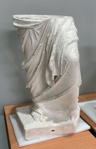 Etat de l'oeuvre : incomplet : il manque le bras gauche, une grande partie du bras droit, le pied gauche. Le nez présente des éclats. Le dos présente de nombreuses épaufrures. la plinthe a été retaillée dans l'Antiquité. Le chignon a été recollé et l'extrémité du nez a été refaite en plâtre.